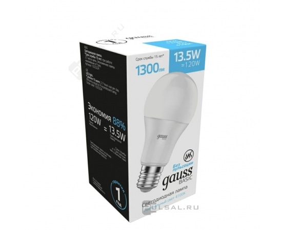 Лампа светодиодная Basic, цоколь - E27, мощность - 13.5Вт, световой поток - 1320Лм, цветовая температура - 4100К, не диммируется, 1023224, Gauss