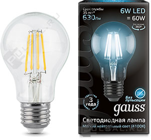 Лампа прозрачная филаментная Black, цоколь - E27, мощность - 6Вт, световой поток - 630Лм, цветовая температура - 4100К, не диммируется, 102802206, Gauss