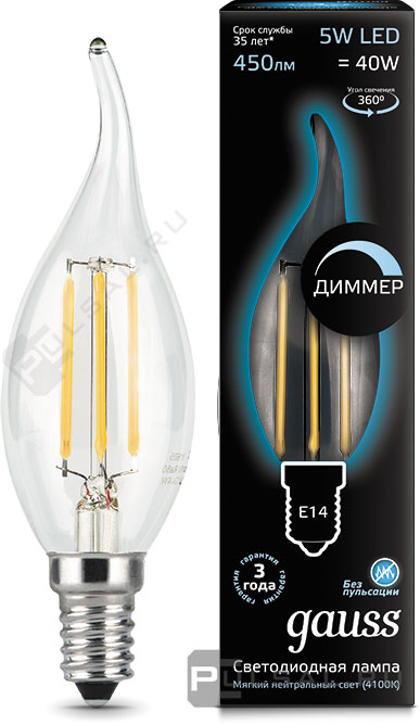 Лампа прозрачная филаментная Black, цоколь - E14, мощность - 5Вт, световой поток - 450Лм, цветовая температура - 4100К, диммируется, 104801205-D, Gauss