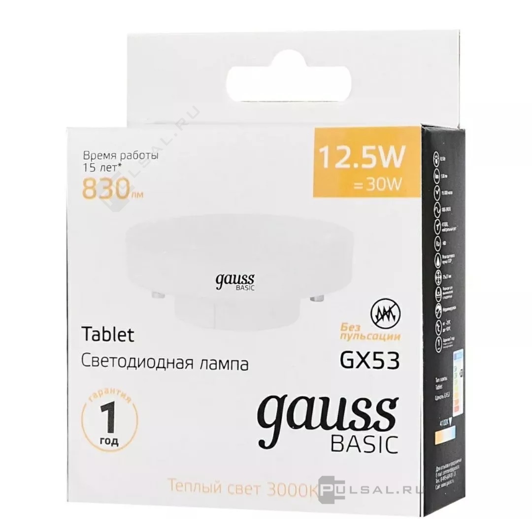 Лампа светодиодная Basic, цоколь - GX53, мощность - 12.5Вт, световой поток - 830Лм, цветовая температура - 3000К, не диммируется, 10849132, Gauss