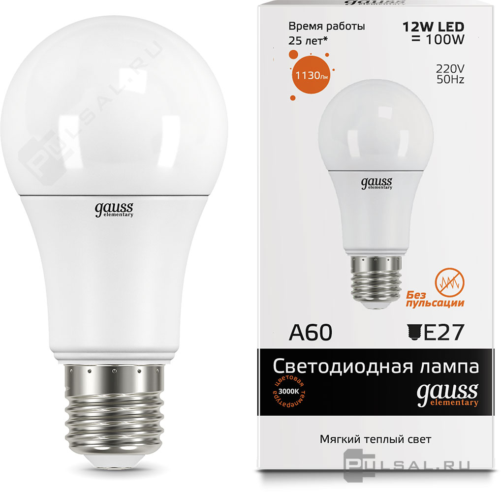 Лампа светодиодная Elementary, цоколь - E27, мощность - 12Вт, световой поток - 1130Лм, цветовая температура - 3000К, не диммируется, 23212, Gauss