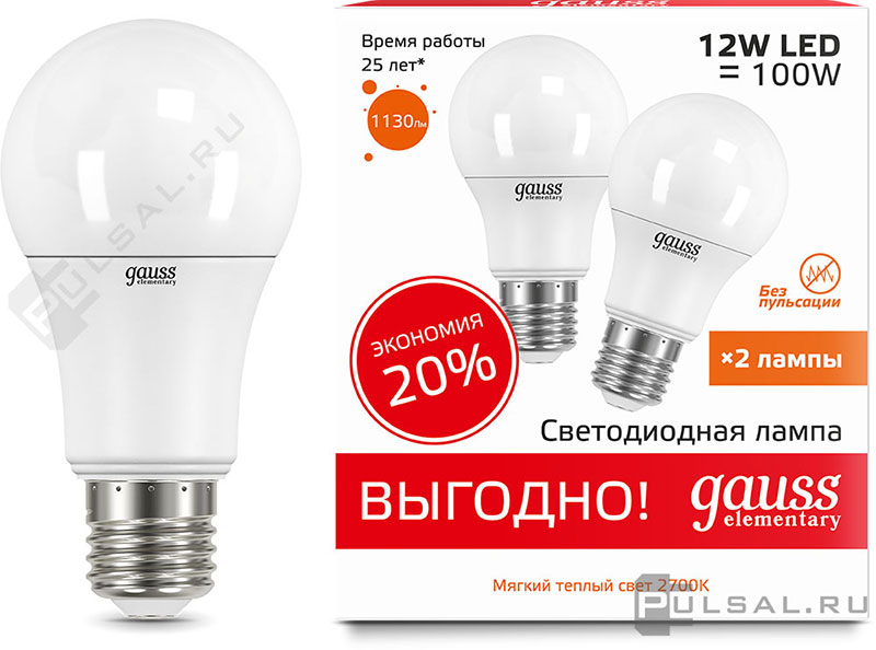Лампа (2 лампы в упаковке) светодиодная Elementary, цоколь - E27, мощность - 12Вт, световой поток - 1130Лм, цветовая температура - 2700Кцветовая температура - 3000К, не диммируется, 23212P, Gauss