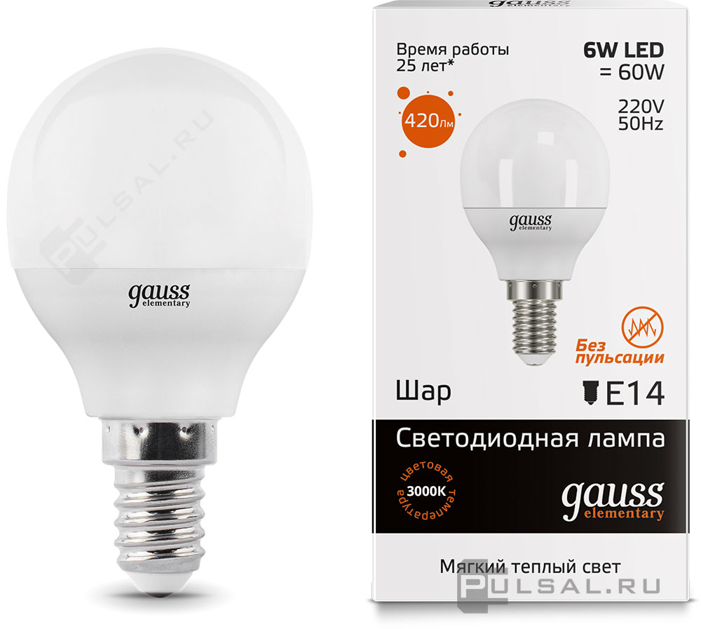 Elementary, цоколь - E14, мощность - 6Вт, световой поток - 420Лм, цветовая температура - 3000К, не диммируется, 34116, Gauss
