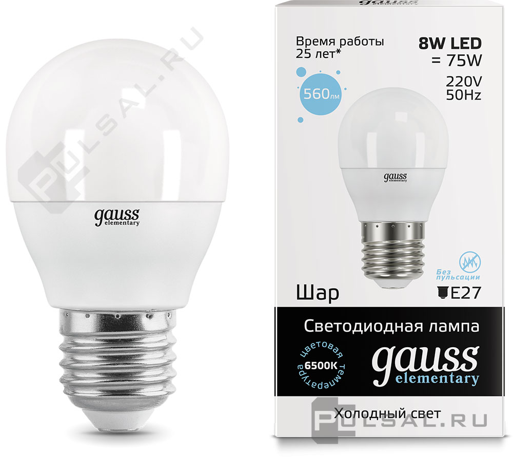 Elementary, цоколь - E27, мощность - 6Вт, световой поток - 470Лм, цветовая температура - 6500К, не диммируется, 53236, Gauss