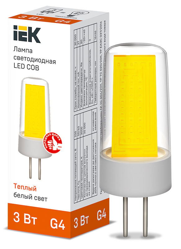 Лампа светодиодная Лампы IEK, цоколь - G4, мощность - 3Вт, световой поток - 285Лм, цветовая температура - 3000К, не диммируется, LLE-COB-3-230-30-G4, IEK