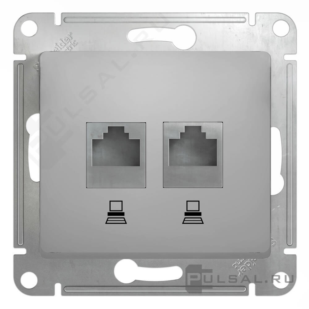 Розетка телефонная RJ11 + компьютерная RJ45 Cat.5e (UTP) Glossa, двойная, цвет - алюминий