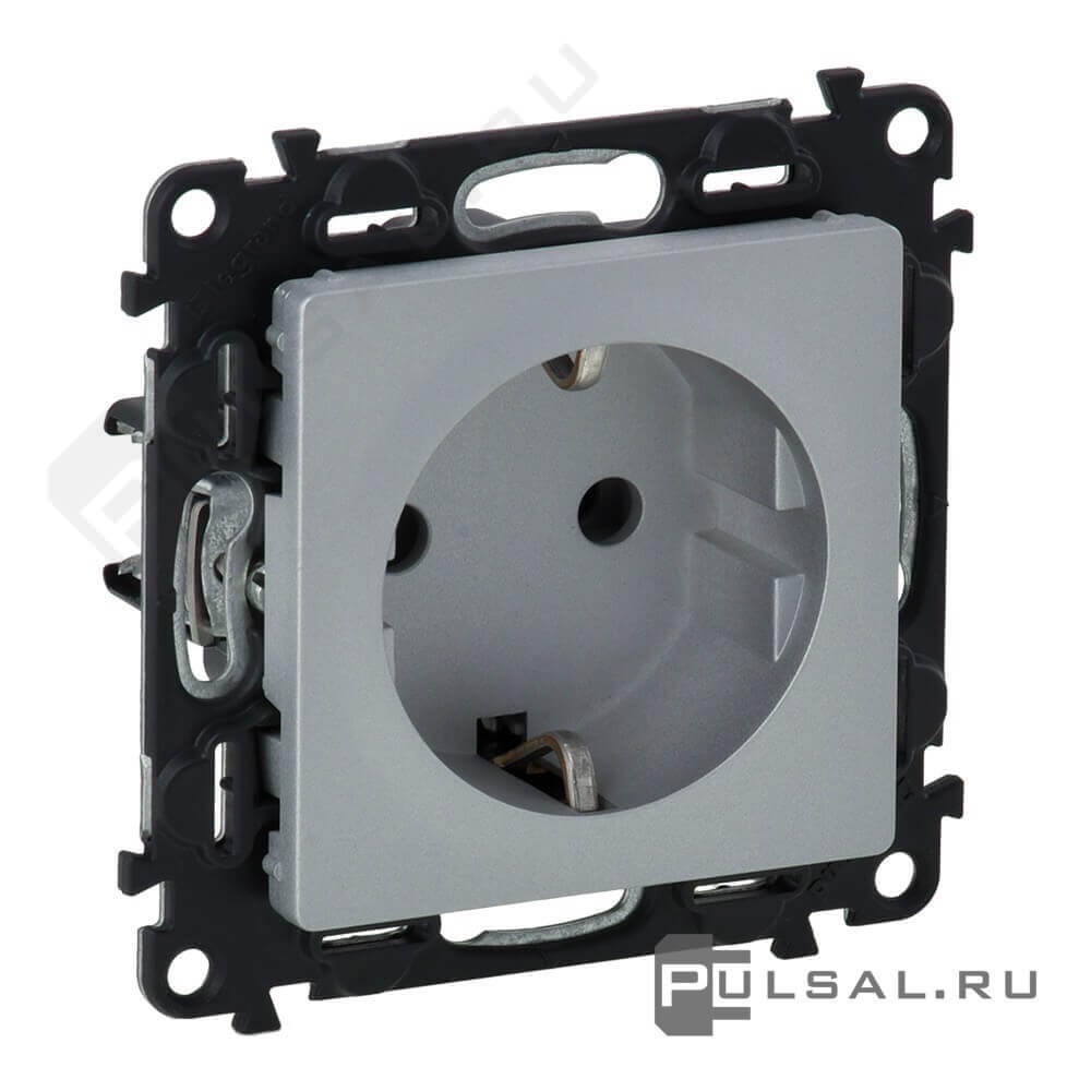 Розетка Valena Life, без шторок, с заземлением, одинарная, безвинтовые клеммы, цвет - алюминий