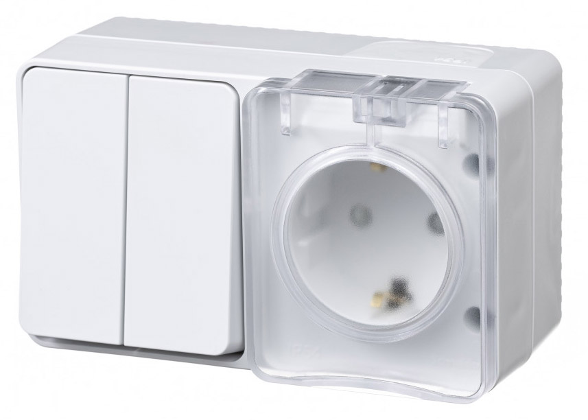Блок, розетка + выключатель Atlas Design Profi 54, со шторками, с крышкой, с заземлением, одинарная, винтовые клеммы, цвет - белый
