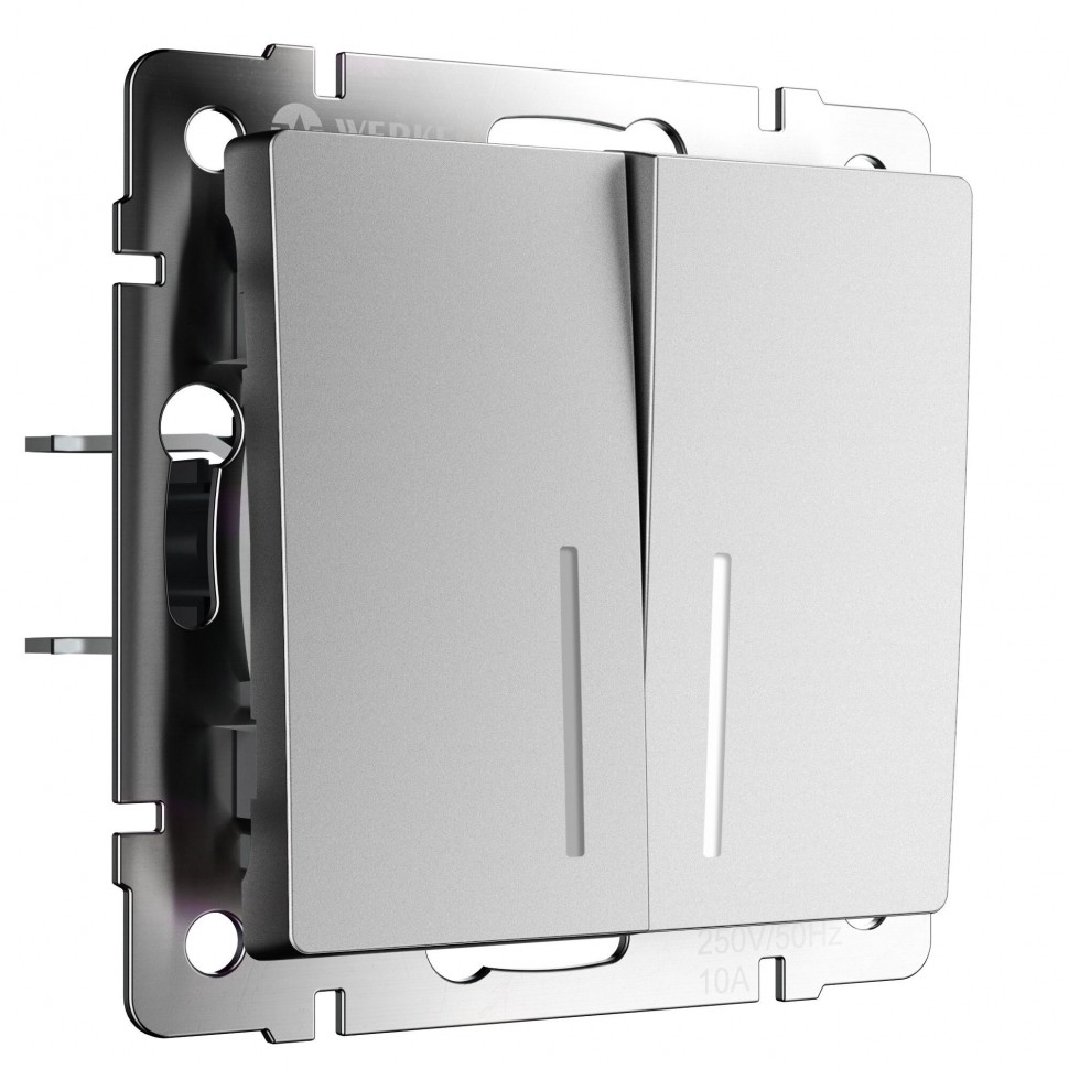 Переключатель Alumax, Split, Slab, Senso, Baguette, Acrylic, Platinum, Elite, Snabb, Stream, Flock, Stark, Fiore, Favorit, Diamant, Aluminium, Antik, Metallic, двухклавишный, без подсветки, цвет - серебряный матовый