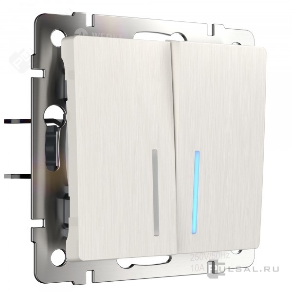 Переключатель Alumax, Split, Slab, Senso, Baguette, Acrylic, Platinum, Elite, Snabb, Stream, Flock, Stark, Fiore, Favorit, Diamant, Aluminium, Antik, Metallic, двухклавишный, с подсветкой, цвет - перламутр рифленый