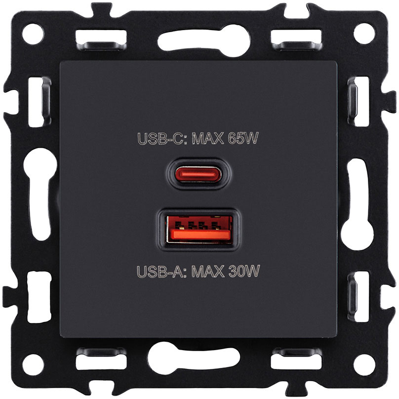 Розетка USB type-C + type-A, 3.0А 65Вт Asthetik, USB type-C 5V, USB type-A 5V, двойная, цвет - черный