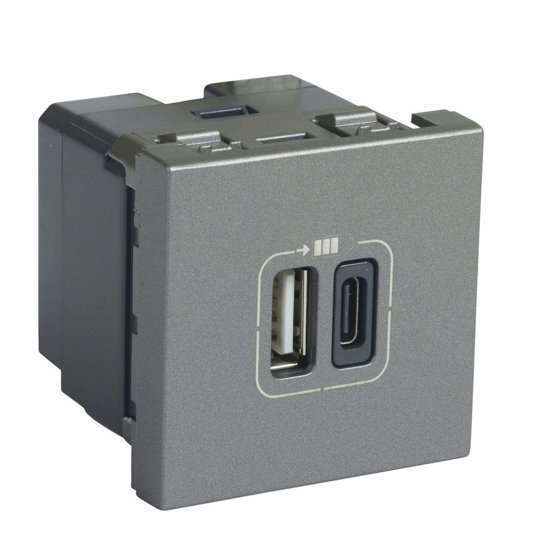 Зарядка USB type-A+C, 3,0А, 15 Вт Mosaic, DLP floor, DLP IP 44, DLP IP 40, USB type-C 5V, USB type-A 5V, двойная, цвет - алюминий