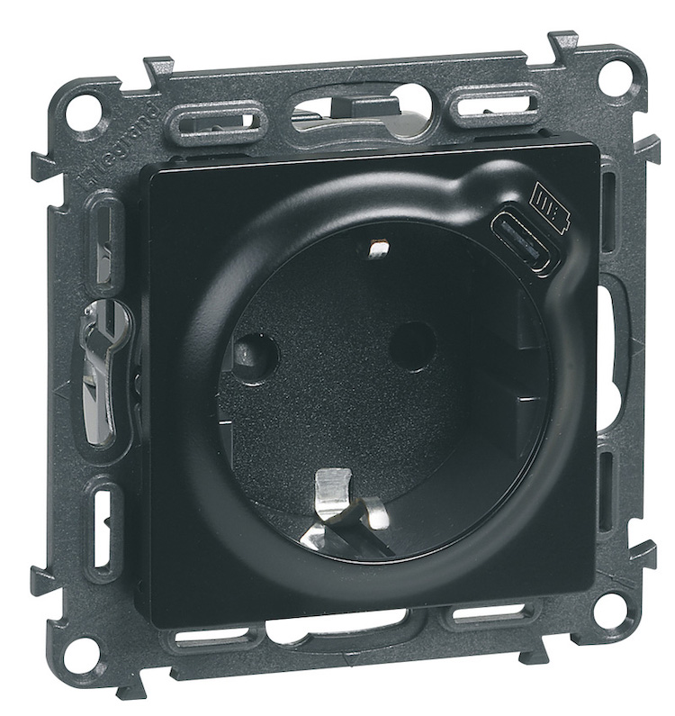 Розетка Valena Life, без шторок, с заземлением, одинарная, безвинтовые клеммы, цвет - матовый черный