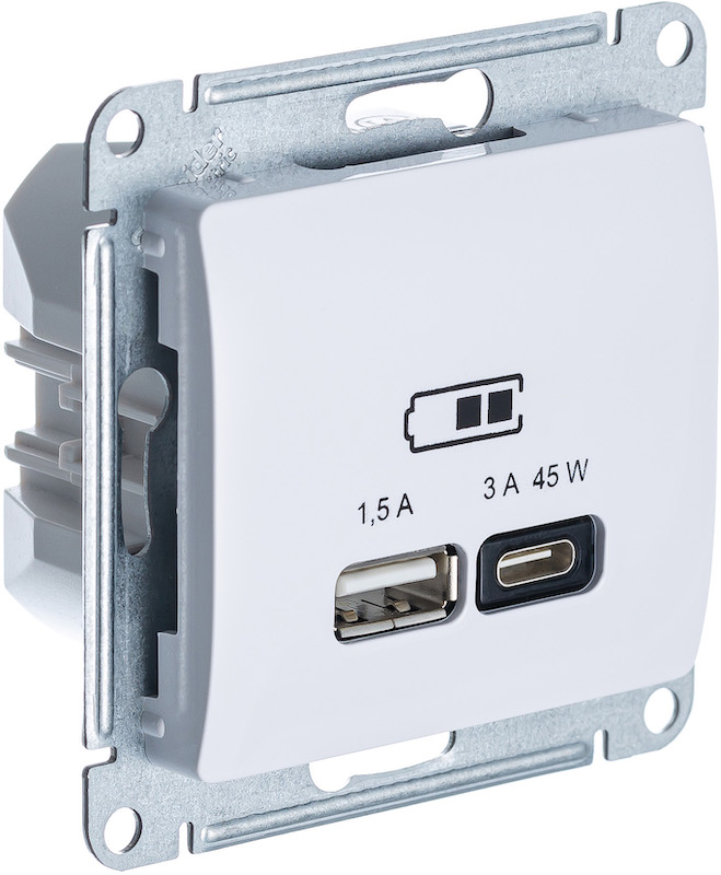 Розетка USB type-C + type-A, 2.4А Glossa, USB type-C 5V, USB type-A 5V, двойная, цвет - белый